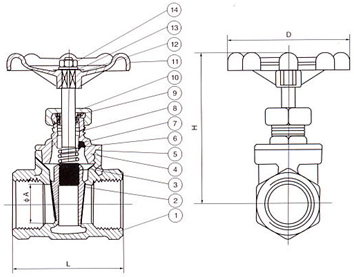 序號NO. 零件名稱 材質 1 閥體 不銹鋼CF8M/CF8 2 閘板 不銹鋼CF8M/CF8 3 閥桿 不銹鋼SS316/304 4 閥蓋 不銹鋼CF8M/CF8 5 填料 聚四氟乙烯PTFE 6 止推墊片 不銹鋼SS304 7 閥桿架 不銹鋼SS316/SS304 8 填料 聚四氟乙烯PTFE 9 螺母 不銹鋼SS304 10 填料壓蓋螺母 不銹鋼SS316/SS304 11 手輪 鋁合金 12 鉻牌 鋁 13 手輪墊片 不銹鋼SS304 14 手輪螺母 不銹鋼SS304 主要連接尺寸及重量 單位:mm